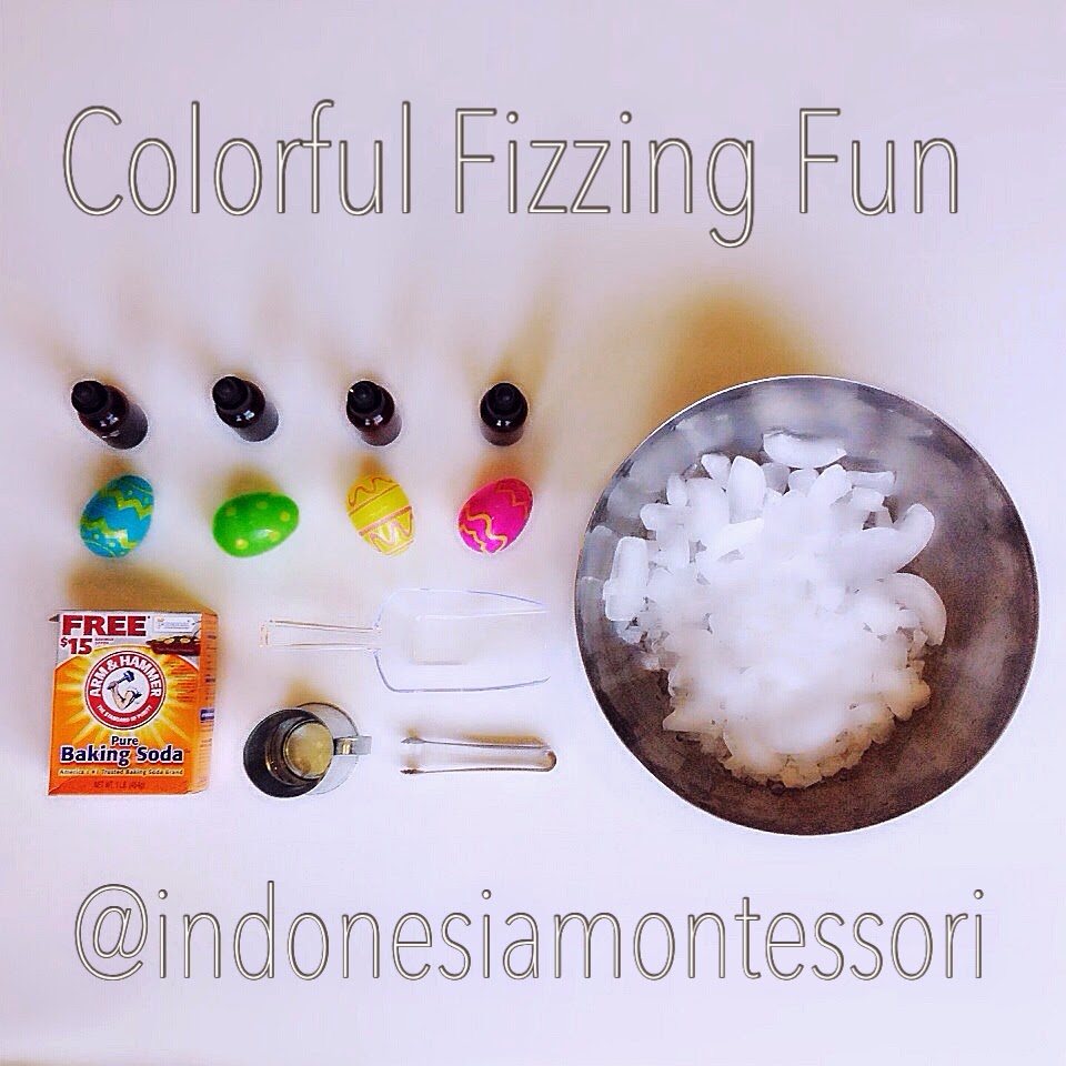Kali ini, kita main sensory bin yang dingin-dingin yah…pertama-tama..siapkan es batu di wadah yang cukup besar…(mixing bowl is perfect) , lalu siapkan beberapa botol/wadah untuk setiap warna cuka…Pada kegiatan ini saya berikan 4 warna cuka yang berbeda… (Campurkan cuka dengan pewarna makanan 1 atau 2 tetes atau sesuai selera) Lalu siapkan soda kue, alat-alat penunjang lainnya seperti tong/ tweezers, sekop, dll.